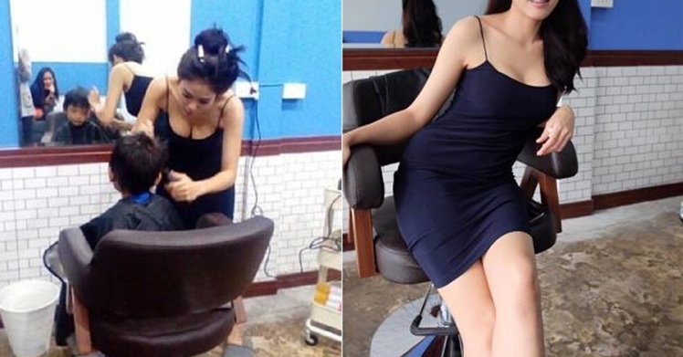 性感美女理髮師只穿細肩帶「露大碗公」剪髮